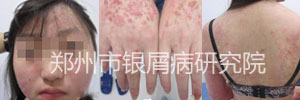 患者是半年前患银屑病,之前并无类似症状,小腿部先出现一些颗粒大的炎性扁平丘疹,逐渐增大为钱币淡红色浸润斑,境界清楚,白色鳞屑覆盖其上,由于小丽正准备结婚,突遇腿部红疹,男方家长知道后提出取消婚姻,小丽家人十分着急,一边四处寻找偏方治疗,一边在当地医院就诊,经过一段时间的药物治疗后,腿部红疹有所减少,皮屑也逐渐消减,停药后,不仅腿部牛皮癣发作,而且脸部和头部也长出新的皮屑和红斑。邻居都嘲笑她,男方家长限制两人来往,小丽父母更是着急,四处打听,来到了郑州市银屑病研究所。
