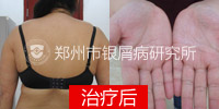 一个疗程后,身上原先融合成片的大块银屑病开始消退,瘙痒情况也得到了很好地控制。接着治疗一个疗程后,皮损斑块已经完全消退,仅留有少许的色素沉淀斑,不再有任何瘙痒。