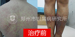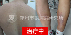 查体:全身散在点片状皮损伴鳞屑,以四肢皮损较重,多处新出红色点状皮损。已告知病人及其家属,近期有加重情况是属于正常,病人及家属表示理解并同意治疗!