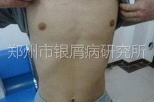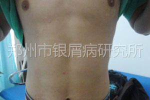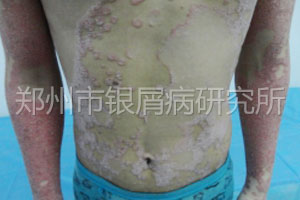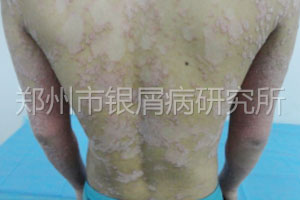 查体:患者全身散落皮损伴较多鳞屑有新出红色点疹。经检查患者处于进展期在治疗期间会有新出,表示理解并同意治疗。