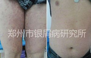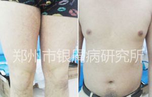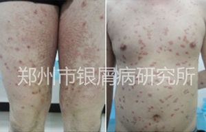 查体:全身散在点片状皮损伴鳞屑,以头部、四肢皮损较重,右侧腋下出现激素纹,多处新出红色点状皮损。已告知病人及其家属病情处于急性发展期,近期有加重情况是属于正常,病人及家属表示理解并同意治疗。