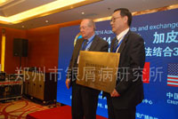 除此之外,大会还特别启动皮肤病“国际转诊”合作项目。郑州市银屑病研究所无论是在医院整体配置、专家资质方面,还是在先进设备、前沿技术、学术交流方面,在区域内都遥遥领先。正是看中了医院过硬的综合实力,美国、加拿大方面特别指定郑州市银屑病研究所为河南地区指定技术合作单位。伯纳德葛菲教授亲自为郑州市银屑病研究所颁发“国际皮肤病诊疗技术临床指导医院”铜牌。