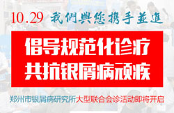 郑州市银屑病研究所积极响应世界银屑病日的主题和宗旨,开展“倡导规范诊疗·共抗银屑病顽疾”世界银屑病关爱日活动。活动期间不仅有银屑病宣传手册免费发放,让更多的人正确认知银屑病;而且有银屑病资深医师为您实时解答问题,通过网络、电话等渠道免费咨询、挂号、预约;除此之外,医院征集10名特殊银屑病患者,免费联合会诊,让患者得到规范、安全、有效的治疗。
